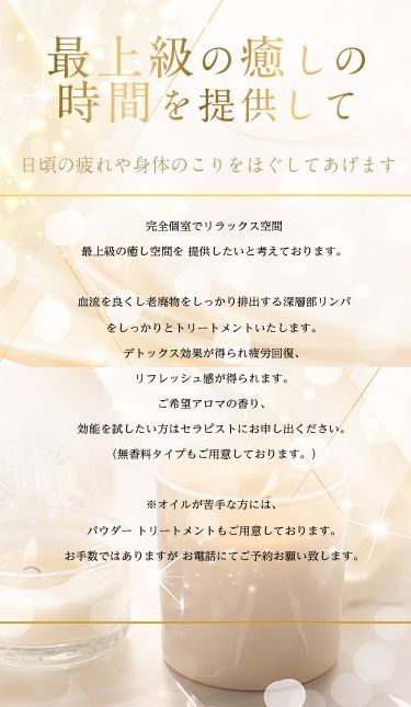 最高のリラクゼーションをご提供させて頂くために、最高の空間や施術、セラピストをご用意いたしました。 高いレベルでのお客様の心身をケアを目的に、セラピストには徹底した技術指導とお客様へのおもてなしの指導を行っております。これから先もずっと永遠にお 客様のオアシスでありたい、そう私共は考えております。